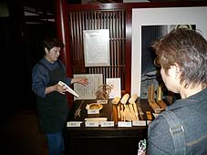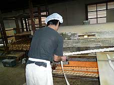 | 10月4日(木) 麩 産業観光のプログラムづくりのために加賀能登のれん会の会員企業を訪ねている。最初にお邪魔したのは加賀麩司宮田さん。東山の「鈴庵」という麩料理の店を見学を兼ねて訪ね、麩ぜんざいをご馳走になる。その後、浅野本町の工場に行く。初めて麩の工場を見学したが、手作業で焼麩を作る仕事は拝見していて面白い。実際に作業をされているスタッフも10年やっているという方で、愛想もよい。職人的な雰囲気も伝わってきて、楽しめるところです。生麩の仕事も手作業が多くて大変そうでしたが、価値が伝わってきますね。最初に工場見学をさせていただき、その後に「鈴庵」で麩料理をいただく、そんな流れでしょうか。3時間コースぐらいにはなります。工場でいただいた作り立ての麩まんじゅうも美味でした。焼き立ての麩も香ばしそうで、食べてみたいものだ。 | ![]() 焼き麩を作る |