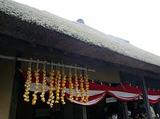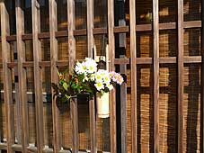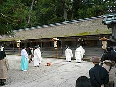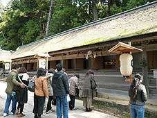 | 11月23日(金) 神在祭の出雲 神在祭の様子を観に出雲大社に行く。出雲市駅より一畑電車で向かう。途中、川跡(かわと)という駅で乗り換えるが、のどかな出雲の田園風景が広がり、特に乗り換えて出雲大社に向かう途中に見える山の様子はいい雰囲気です。電車に乗っているのは若い女性が多い。「神迎の道」では、空き店舗などを使ってイベントを行っており、各家々には竹で作った「潮汲み」に花が生けられています。お茶屋さんでぜんざいをご馳走になり、出雲大社に向かう。大社さんの中は人でごった返していたが、神官たちが執り行う神事を拝見できた。神在祭ならではですね。両脇にある八百万の神々が滞在しているという「十九社」は戸があけられ、供え物がされていて、多くの人がお参りされています。砂利が敷かれた参道を歩いて戻る。再び一畑電車で出雲市駅に戻り、商店街を見学して回り、あおいやさんでお茶をご馳走になる。夜は「こん吉堂」さんでいただく。