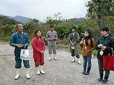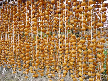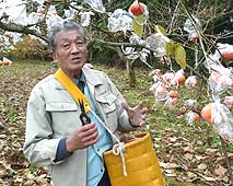 | 11月27日(火) 山岸果樹園 午後から能登町内浦庁舎で雇用創出事業の会議があったので出かけた。途中、内浦放牧場の近くにある山岸政盛さん(自宅は能登町字合鹿 TEL 0768-76-0284)の果樹園を訪れる。3度目であるが、ご主人もいらしたので写真を撮影させていただく。ちょうど、樹上でさわした柿の収穫中であった。収穫してからさわす方法と樹上でわさす方法とあるそうだが、樹上でさわす方がしゃきしゃきした食感になるとのこと。小さな袋に固形アルコルーを入れて青いうちに袋で一つ一つを覆うそうである。手間のかかる仕事であるが、美味しい果物を作るためにはいろいろな工夫をされているものです。りんごと柿がメインであるが、栗、銀杏、ブルーベリーも少し栽培されていて、楽しい果樹園です。作業小屋の横では鶏も飼われています。りんごと柿は不動寺の「おくのといち」でも販売されていました。 | ![]() 柿を収穫する山岸政盛さん |