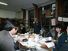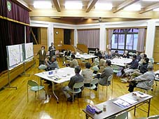 | 11月10日(土) まちづくり元気塾3 まちづくり元気塾の3回目である。旧中山小学校の活用についてアイデアを出し合っていただく。その前に、濱さんからはこれまでの整理と課題を、高峰からは事例報告として、白山麓のにわか工房とせせらぎのことを紹介させていただく。さらに、東北芸術工科大学の学生諸君からの提案もしていただきました。昼は餅つきをして、つきたての餅をおいしくいただきました。午後のグループワークの前に、学校を再度見て回り、気付きの促進を図っていただくプログラムになっていました。事務局の大木さんの企画ですが、当方が常々お話ししていることを踏まえてくれています。最後に2つのグループから発表いただきましたが、それぞれ、「学校」がタイトルについた案になっており、皆さんの愛着が表れているようです。今回の意見を踏まえて最終案をまとめたいものです。その後、上山に移動し、商店街の若手や「上山まちづくり塾」のメンバーと懇親会。お宿に帰ったのは0時過ぎでした。 | ![]() 旧中山小学校での元気塾の様子 |