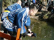 1月7日(水) 厄払い鯉の放流 | ![]() 鯉を放流する安城市の方々 |
