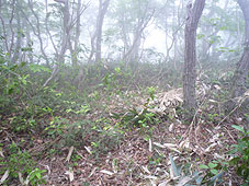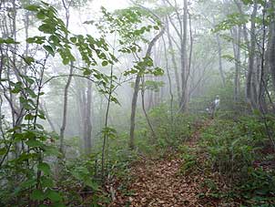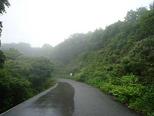 ![]() ブナ林内の歩きやすい森の道 | ![]() 雨に煙る今朝のブナ林を道路から見た様子 |