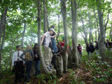6月15日(月) アメリカの中学生、鉢伏山へ | ![]() 早速ブナの木に登って遊ぶアメリカの中学生たち |