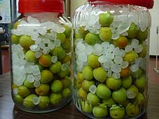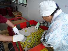![]() 選別作業をする萩村さんたち | ![]() きれいな梅 | ![]() 梅ジュース用に漬け込む |
