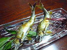 ![]() 鮎の塩焼き | ![]() 刺身の盛り合わせ | ![]() 自信作のステーキ |