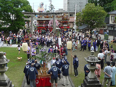 7月20日(月) 燈籠山祭り | ![]() 春日神社での曳出式、鳥居の上に見えるのが燈籠山です |