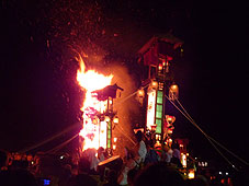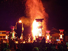 ![]() やまださの昆布巻き | ![]() 燃え盛る大松明とキリコ | ![]() 大松明からの火の粉を浴びるように見えるキリコ |