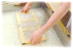 | ■和紙体験 「和紙づくり」が、合掌造りの立派な空間で体験できます。 ![]() まず、和紙の原料を入れた槽の中に、 手前から枠を入れ、平らにすくいあげます。 それを2度繰り返し、生地を作ります。 |