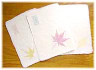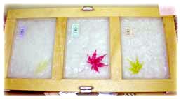 一番簡単な紙漉きなら、30分程度でも可能。 時間に余裕のある方は、少し高度な体験に挑戦してみましょう。 ![]() 次に、水分が落ちた和紙の上に、 色のついた葉っぱなどを乗せ、 さらに原料をひしゃくでかけます。 |