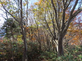天気が良い予報だったので鉢伏山へ。朝早く起きてご飯を炊き、おむすびを作り、5時前に家を出て能登に向かう。ラジオ深夜便では、シリア難民の写真を撮り続けている写真家の話が流れていた。能登事務所に7時前に到着。お茶を沸かして、冷ましてペットボトルに入れてリュックに入れて準備完了。今日は、大箱集落の奥の林道を歩いて鉢伏山を目指す。危険を感じる崩落現場は2ケ所で、ほかにもたくさんの崩落はありますが、なだらかな道なので歩きやすい。2時間でブナ林に到着。ブナ林内で休憩。さらに林道を歩き10:35には頂上エリアへの入口に到着。移植ブナの周りを広がる作業を行い、根元の周りに肥料を施す。中央大生が移植してくれたエリアの作業を終える。雨が降ってきましたが、能登町側の下の方に生えているブナの様子を確認に下ってみた。ネマガリタケが生えてきていて、以前つけた下る道が分かりにくかった。急ぎ戻るが、途中ブナ林内で落とした帽子を探し発見。最後は暗くなってきて厳しい難所越えに手間取るが無事帰着。 | ![]() 鉢伏山のブナ林 |