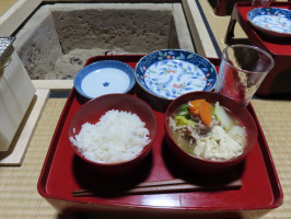 朝6時半過ぎには金沢を出て能登へ。途中、穴水に寄り、かきまつり準備の様子を撮影して回り、能登事務所へ。まずは囲炉裏に炭を入れて、先日ホームセンターで見つけた着火装置を使って点火してみた。公民館に日本大学さんの件を確認に参り、事務所前の雪を動かす。休憩をはさみ、何度かに分けて行い、当方の車を雪山の前面に入れられるようにする。雪作業を行っていた際に、仮設団地に来ておられた方に教えていただいた池下さん(天坂)を探し訪ね、炭を分けていただく。当目の小箱政治さんに炭焼きを教わって始められたとのこと。近くで炭を焼く方がおられて有難い。能海山市場で買い物をして、ケロンの小さな村に立ち寄り、事務所に戻る。さらに追加で雪を動かし学生さんたちの到着を待つ。到着後、とり野菜みそ鍋を作ってもらい、いろりの周りに御膳を並べて夕食。池下さんから譲っていただいた炭がきれいに燃えてくれて温かい。 | ![]() 本日の御膳 |