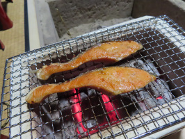 本日も朝5時過ぎには起きだし、囲炉裏の灰をかけてあった炭火の灰をどかして、新たな炭を加える。しばらくして、積み上げた炭の真ん中に火が移っていました。7時過ぎには、昨日能海山市場で購入したなめこの味噌汁を作り始める。大根の煮物に葉っぱの部分を刻んで加えて温める。学生諸君が買ってきていた銀鮭を解凍。学生諸君が起きてきて、8時過ぎには御膳をセットし、珪藻土コンロに赤くなった細い炭を並べて銀鮭を焼く。表面に焦げ目が少なく焼けているのか不安でしたが、十分のようでした。連日、炭火を活かした食事を楽しんでいただけて何よりでした。9時半には学生たちを見送り、シーツ類を洗濯し干す。4人分は完了しましたが、残りは次回に。灯油を一通り入れて、空になったポリを3つ車に積み柳田へ。トイレットペーパーを購入し、福池さんを訪ね相談。灯油を入れて戻り、掃除機をかけて家に戻る。 | ![]() 珪藻土コンロで銀鮭を焼く |
