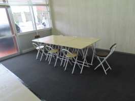 本日も午後から加賀へ。まずは白山市の大きなホームセンターで買い物。チャレンジショップに入れる机、椅子、テープを購入。加賀市松が丘のチャレンジショップに持ち込み、箱から出し設置してみた。タイルカーペットの端をテープで止めました。机と椅子は不要であれば、押し入れに収納可能です。タールカーペットもはがせます。写真を撮影して大聖寺へ。午後4時からは地域おこし協力隊の面接。夕方には、本日開店した焼き鳥半(なかば)をのぞいてみた。派手な看板やのぼりなども出しておられないので、知った人だけがお越しになる感じでしょうか。ゆっくりスタートし徐々に慣れて広げていかれるイメージですかね。焼き鳥は1種類のみです。 | ![]() 椅子とテーブルを入れた状態 |