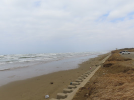 午前は早めに買い物に行き、早めに昼を食べて能登に向かう。午後1時から宝達志水町暮らし体験の家で移住相談。早めに着いたので、千里浜の様子を見に行くが、通行不可と電光掲示に出ていた通り、波が高くて、車が走る砂浜がありませんでした。仕方ありませんね。12時半過ぎには着いたので、暖房をつけて、お風呂を掃除しましたが、お湯が出ないので、ガスのメーターを確認、リセットスイッチを押したら、お湯が出るようになりました。雷などの影響で遮断されたせいか、ガスが止まった状態のようでした。午後1時前に移住希望カップルがお越しになり、今後のイメージをうかがう。いろいろな選択肢がありそうなので、今後興味あるジャンルのお店などを体験して回ることを提案。来年の春までの間に取り組む仕事を絞れると良いです。興味があるというところを外から見学にゆく。 | ![]() 波の高い千里浜 |